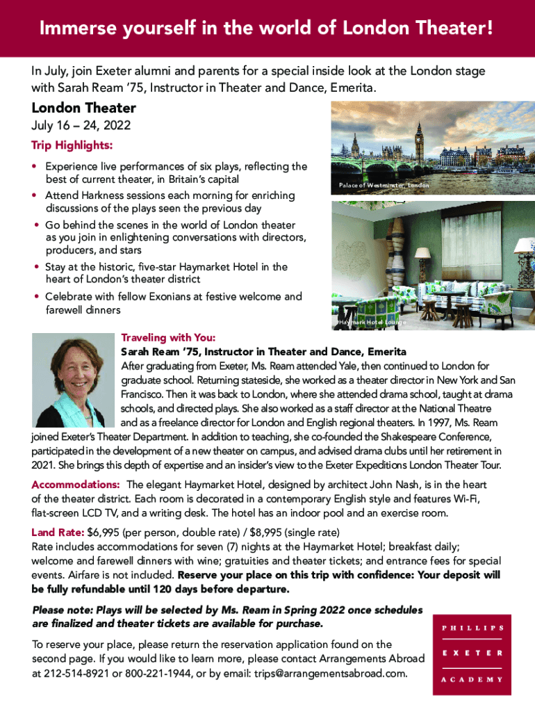 Immerse yourself in the world of London Theater! In July, join Peter alumni and parents for a special inside look at the London stage with Sarah Ream 75, Instructor in Theater and Dance, Emerita.