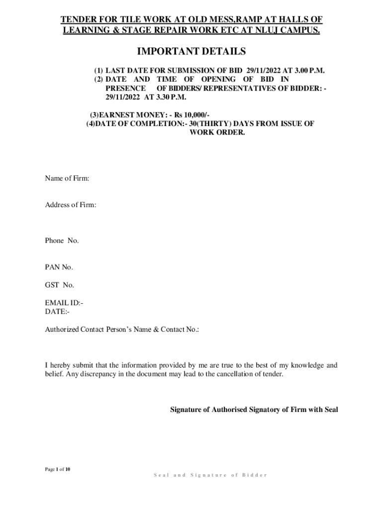 TENDER FOR TILE WORK AT OLD MESS, RAMP AT HALLS OF LEARNING & STAGE REPAIR WORK ETC AT NLU CAMPUS.IMPORTANT DETAILS (1) LAST DATE FOR SUBMISSION OF BID 29/11/2022 AT 3.00 P.M. (2) DATE AND TIME OF