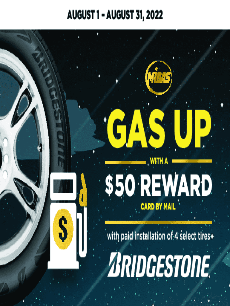 AUGUST 1 AUGUST 31, 2022STEP 1STEP 2Purchase 4 passenger or light truck Bridgestone tires with paid installation at Midas Submit your rebate online for faster processing or via mail. To submit online: