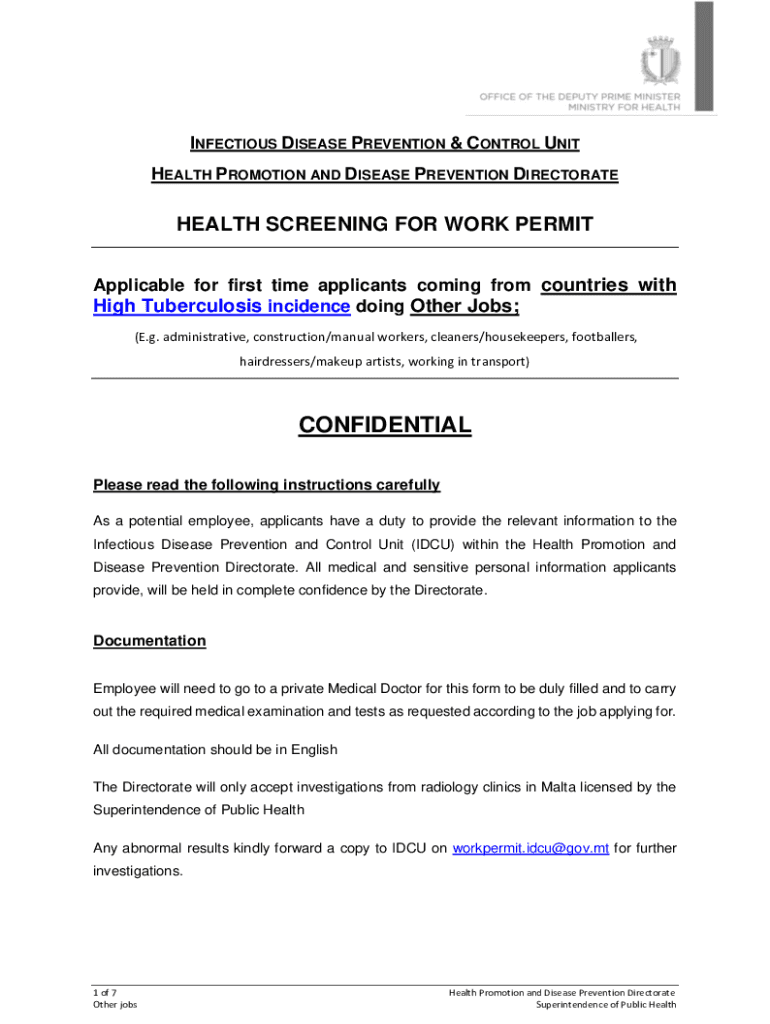 INFECTIOUS DISEASE PREVENTION & CONTROL UNIT HEALTH PROMOTION AND DISEASE PREVENTION DIRECTORATEHEALTH SCREENING FOR WORK PERMIT Applicable for first time applicants coming from countries with High
