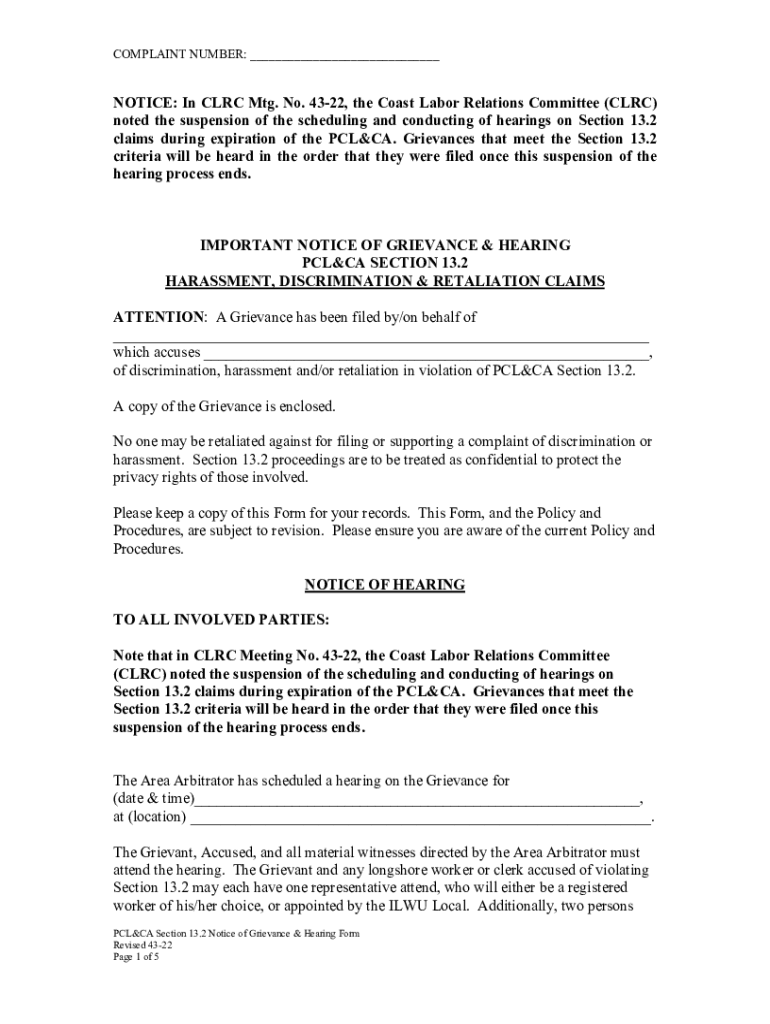 COMPLAINT NUMBER: ___NOTICE: In CLR Mtg. No. 4322, the Coast Labor Relations Committee (CLR) noted the suspension of the scheduling and conducting of hearings on Section 13.2 claims during expiration