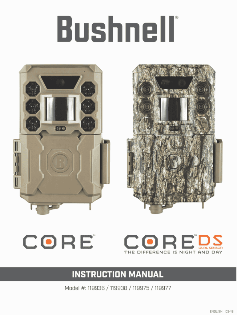 1English / Angles / Single / Singles / Engels Quick Start Guide (119936/119938/119975/119977) For full instruction manual go to: www.bushnell.comTo get Started using your Bushnell Trail Camera: 1.