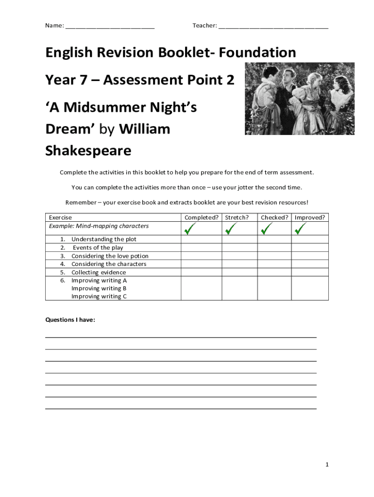 Name: ___Teacher: ___English Revision Booklet Foundation Year 7 Assessment Point 2 A Midsummer Nights Dream by William Shakespeare Complete the activities in this booklet to help you prepare for the