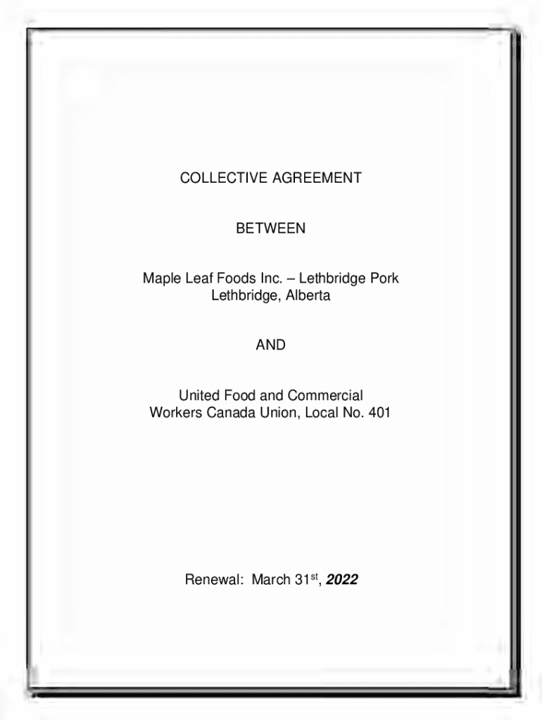 COLLECTIVE AGREEMENTBETWEENMaple Leaf Foods Inc. Lethbridge Pork Lethbridge, AlbertaANDUnited Food and Commercial Workers Canada Union, Local No. 401Renewal: March 31st, 2022Article 1 2 3 4 5 6 7