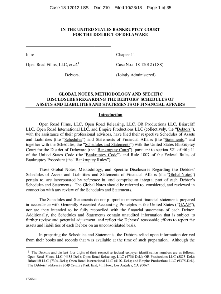 Case 1812012LSSDoc 210Filed 10/23/18Page 1 of 35IN THE UNITED STATES BANKRUPTCY COURT FOR THE DISTRICT OF Delawarean recharter 11Open Road Films, LLC, et al.1Case No.: 1812012 (LESS)Debtors.(Jointly