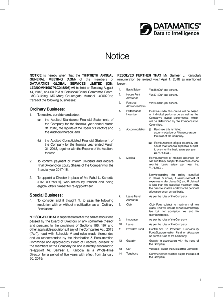 Notice is hereby given that the THIRTIETH ANNUAL GENERAL MEETING (AGM) of the members of DRAMATICS GLOBAL SERVICES LIMITED (IN: L72200MH1987PLC045205) will be held on Tuesday, August 14, 2018, at