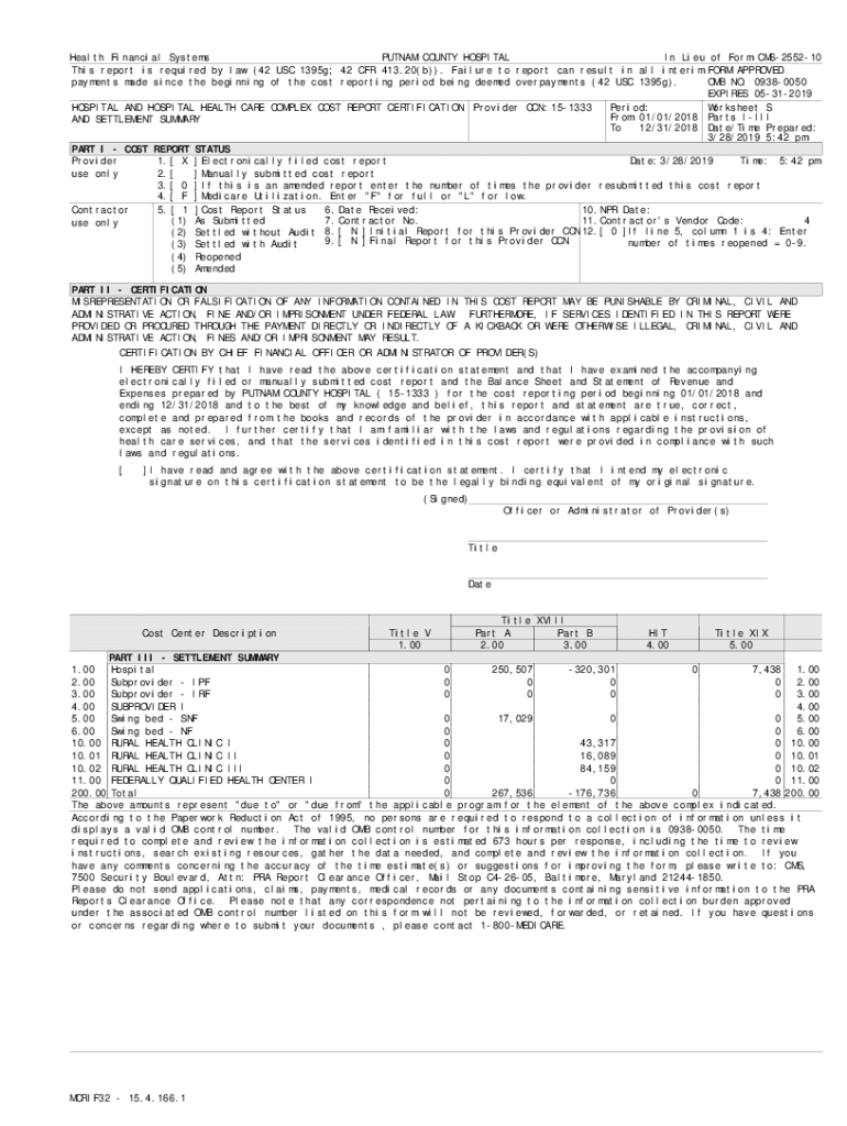 Health Financial Systems PUTNAM COUNTY HOSPITAL In Lieu of Form CMS255210 This report is required by law (42 USC 1395g; 42 CFR 413.20(b)). Failure to report can result in all interim FORM APPROVED