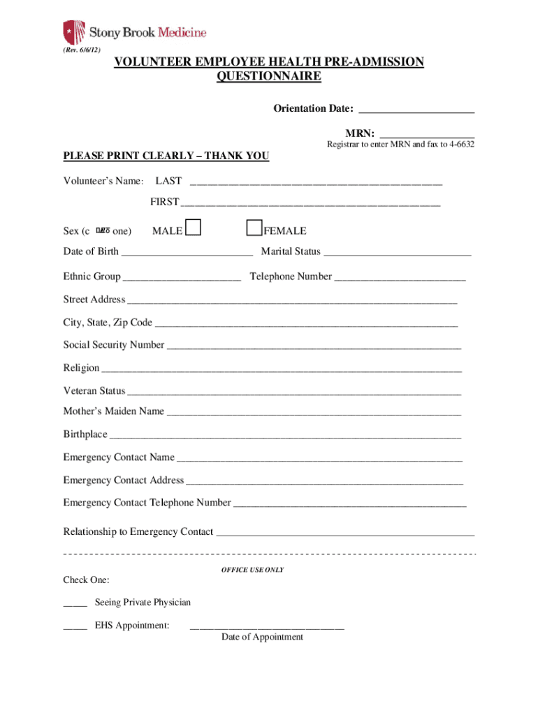 (Rev. 6/6/12)VOLUNTEER EMPLOYEE HEALTH READMISSION QUESTIONNAIRE Orientation Date: ___ MAN: ___ Registrar to enter MAN and fax to 46632PLEASE PRINT CLEARLY THANK YOU Volunteers Name:LAST___FIRST ___