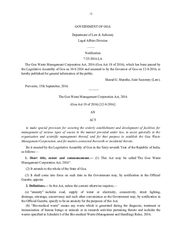 1GOVERNMENT OF GOA Department of Law & Judiciary Legal Affairs Division ___Notification 7/25/2016LA The Goa Waste Management Corporation Act, 2016 (Goa Act 19 of 2016), which has been passed by the