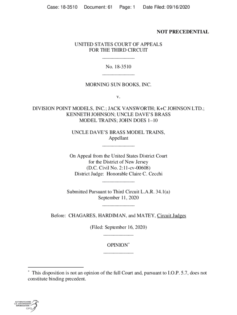 Case: 183510Document: 61Page: 1Date Filed: 09/16/2020NOT PRESIDENTIAL UNITED STATES COURT OF APPEALS FOR THE THIRD CIRCUIT ___ No. 183510 ___ MORNING SUN BOOKS, INC. v. DIVISION POINT MODELS, INC.;