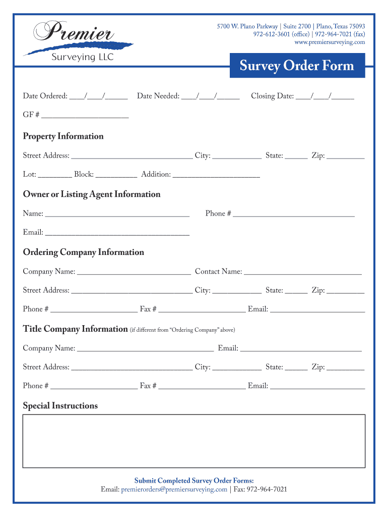 The survey order form must include details about the location, size, and boundaries of the area or property to be surveyed.