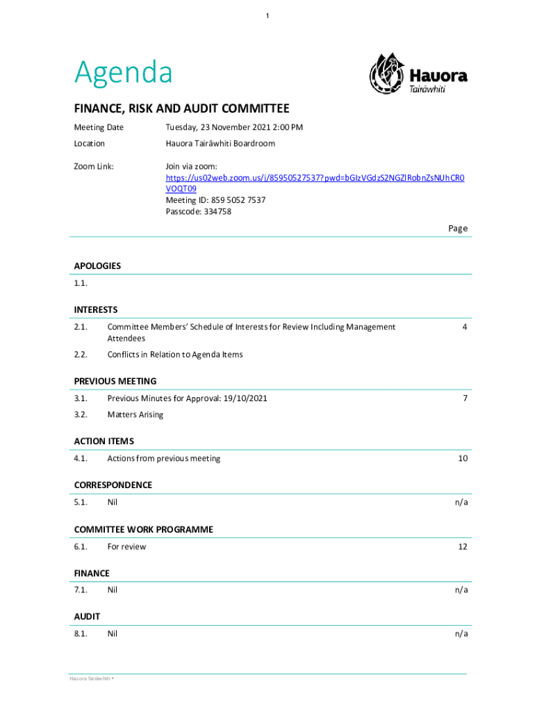 1Agenda FINANCE, RISKANDAUDITCOMMITTEE MeetingDateTuesday,23November20212:00PMLocation Zooming:HauoraTairwhitiBoardroom Joinviazoom: https://us02web.zoom.us/j/85950527537?pwdbGIzVGdzS2NGZlRobnZsNUhCR0