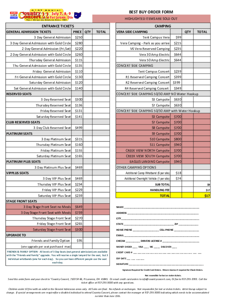 BEST BUY ORDER FORM HIGHLIGHTED ITEMS ARE SOLD ENTRANCE TICKETS GENERAL ADMISSION TICKETSCAMPINGPRICE QTYTOTALVERA SIDE CAMPINGQTY3 Day General Admission$250Tent Campus Vera$993 Day General Admission
