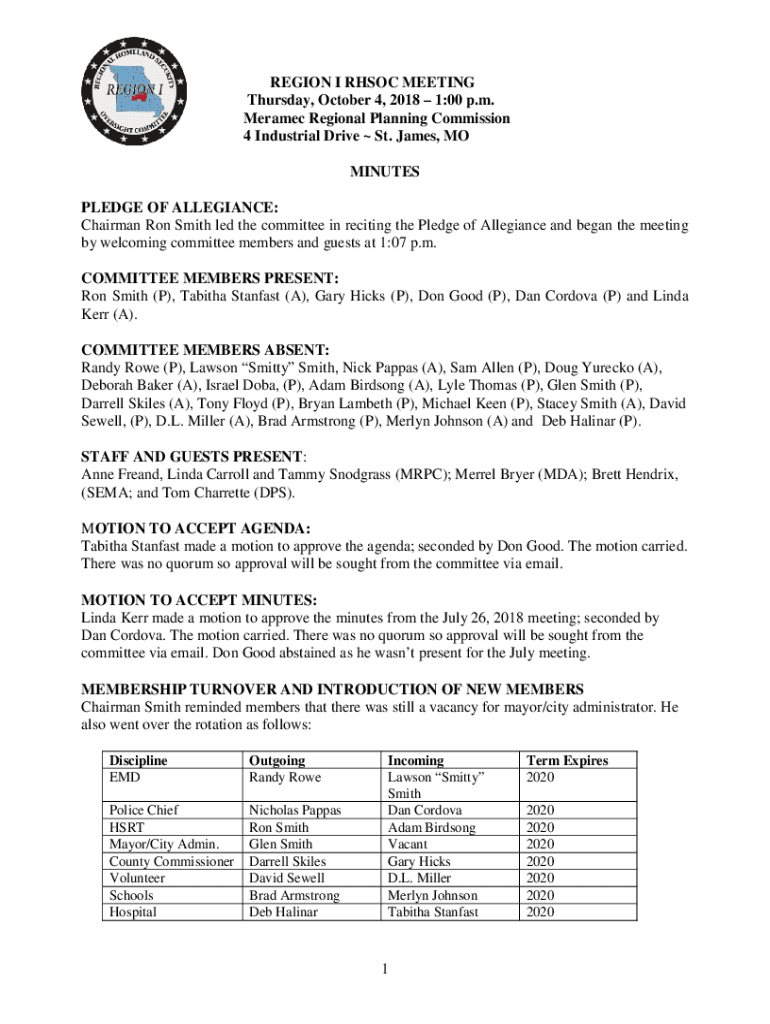 REGION I ROC MEETING Thursday, October 4, 2018 1:00 p.m. Ceramic Regional Planning Commission 4 Industrial Drive St. James, MO MINUTES PLEDGE OF ALLEGIANCE: Chairman Ron Smith led the committee in