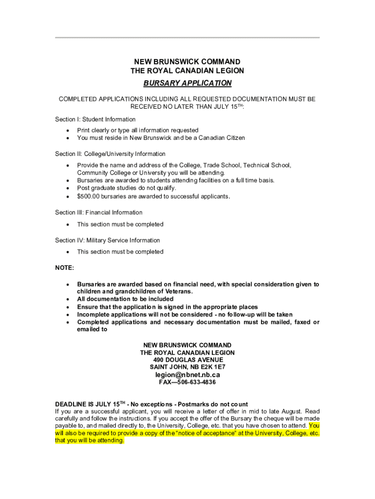 NEW BRUNSWICK COMMAND THE ROYAL CANADIAN LEGION BURSARY APPLICATION COMPLETED APPLICATIONS INCLUDING ALL REQUESTED DOCUMENTATION MUST BE RECEIVED NO LATER THAN JULY 15TH: Section I: Student Information