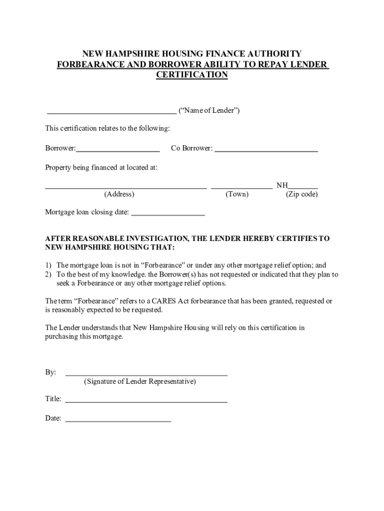 NEW HAMPSHIRE HOUSING FINANCE AUTHORITY FORBEARANCE AND BORROWER ABILITY TO REPAY LENDER CERTIFICATION(Name of Lender) This certification relates to the following: Borrower:Co Borrower:Property being