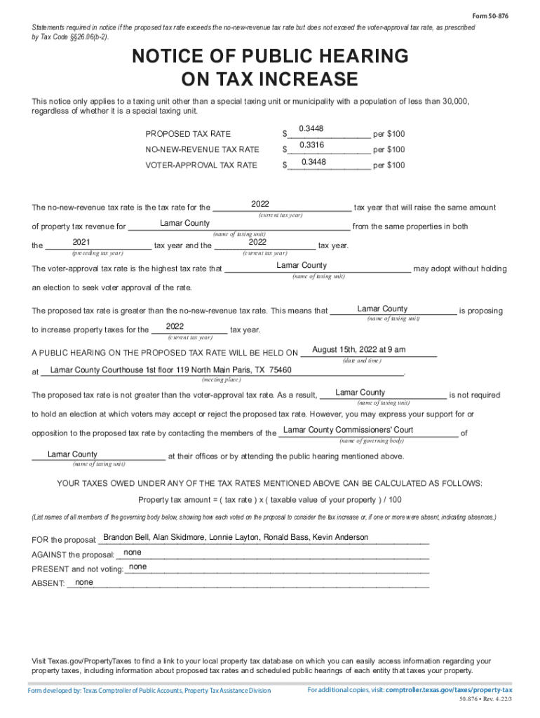 Get the free notice of public hearing on tax increase - Lamar County, Texas