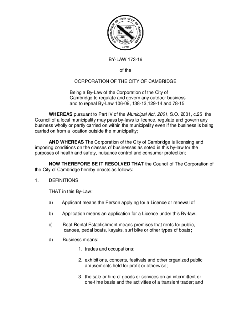 BYLAW 17316 of the CORPORATION OF THE CITY OF CAMBRIDGE Being a Bylaw of the Corporation of the City of Cambridge to regulate and govern any outdoor business and to repeal Bylaw 10609, 13812,12914