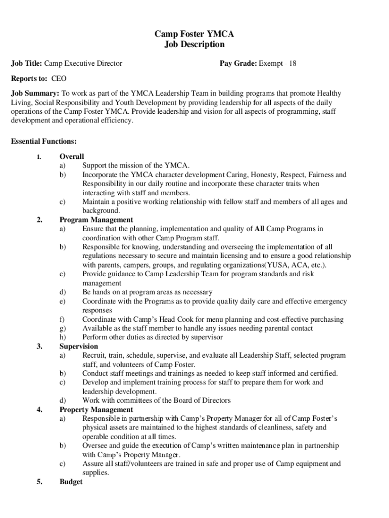 Camp Foster YMCA Job Description Job Title: Camp Executive Directory Grade: Exempt 18Reports to: CEO Job Summary: To work as part of the YMCA Leadership Team in building programs that promote Healthy