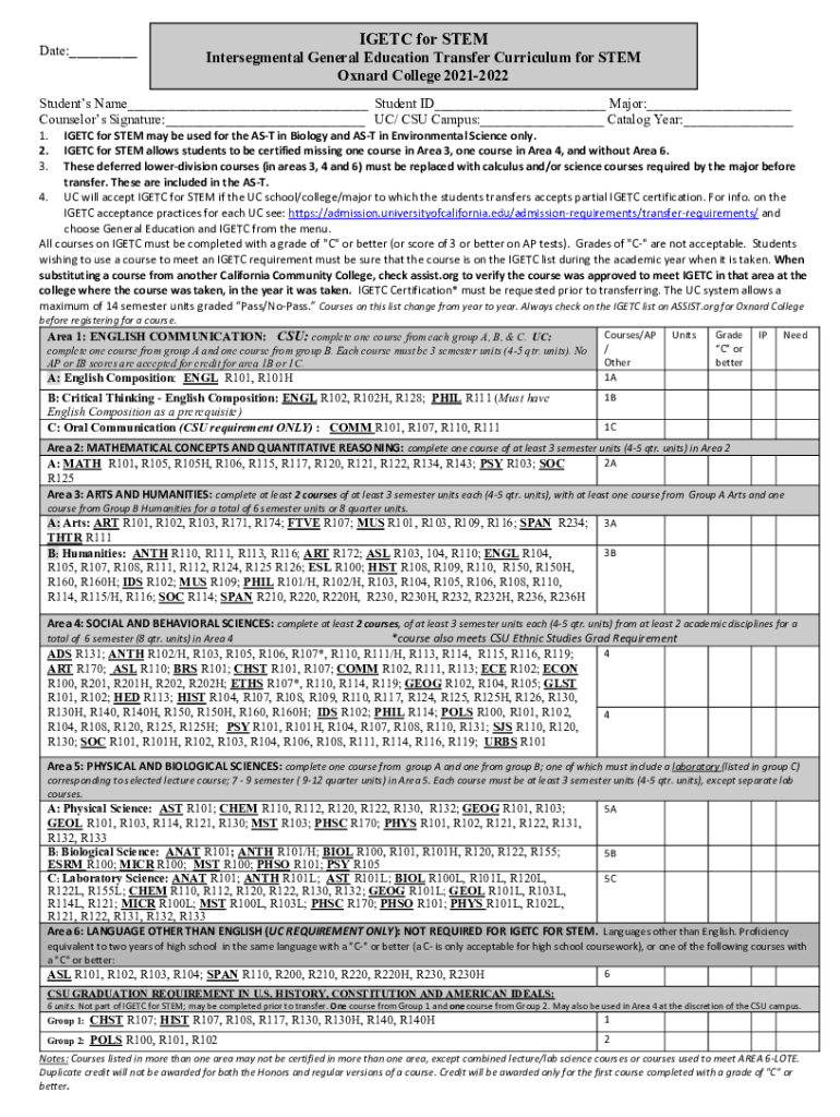 Date:___IGE TC for STEMIntersegmental General Education Transfer Curriculum for STEM Oxnard College 20212022Students Name___ Student ID___ Major:___ Counselors Signature:___ UC/ CSU Campus:___ Catalog