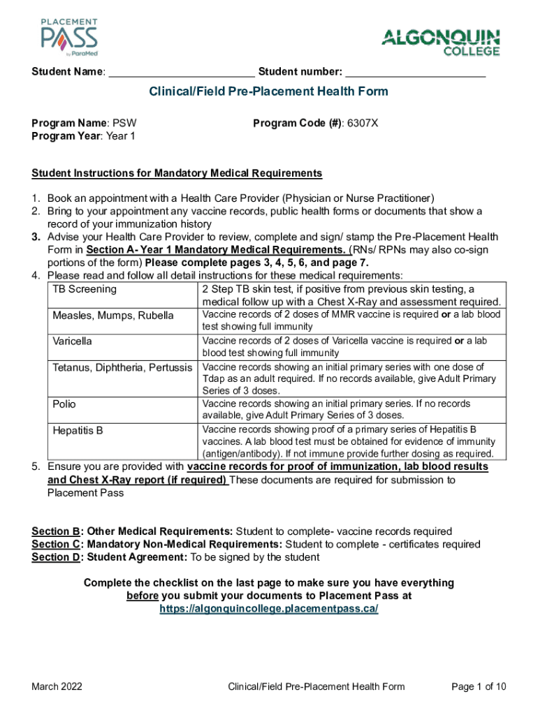 Student Name: ___ Student number: ___Clinical/Field Replacement Health Form Program Name: NSW Program Year: Year 1Program Code (#): 6307XStudent Instructions for Mandatory Medical Requirements 1.