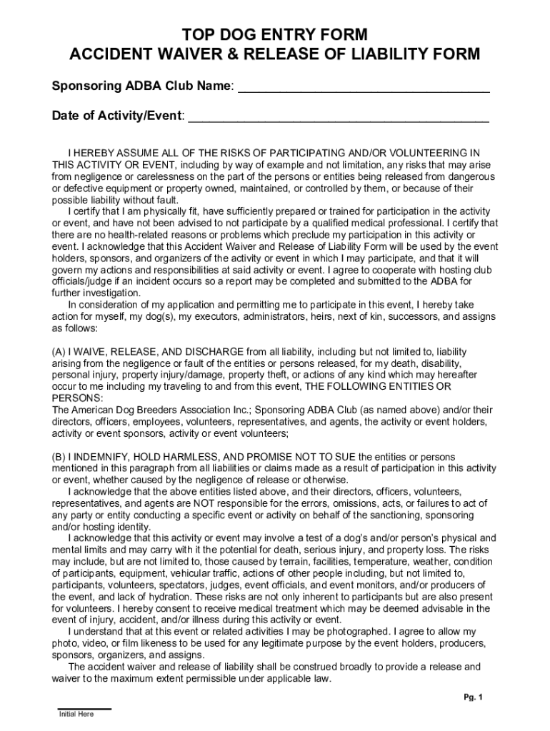 TOP DOG ENTRY FORM ACCIDENT WAIVER & RELEASE OF LIABILITY FORM Sponsoring ADA Club Name: ___ Date of Activity/Event: ___ I HEREBY ASSUME All the RISKS OF PARTICIPATING AND/OR VOLUNTEERING IN THIS