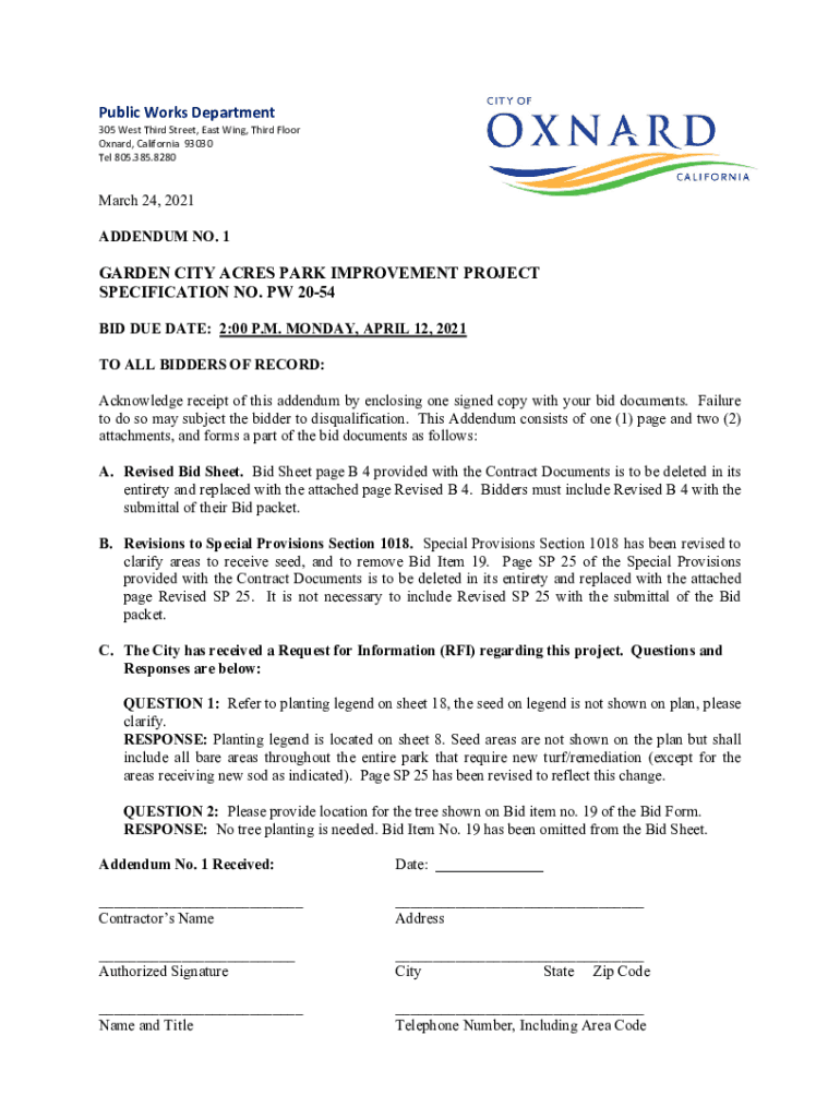 PublicWorksDepartment 305WestThirdStreet,Eating, ThirdFloor Oxnard,California93030 Tel805.385.8280 March 24, 2021, ADDENDUM NO. 1GARDEN CITY ACRES PARK IMPROVEMENT PROJECT SPECIFICATION NO. PW 2054