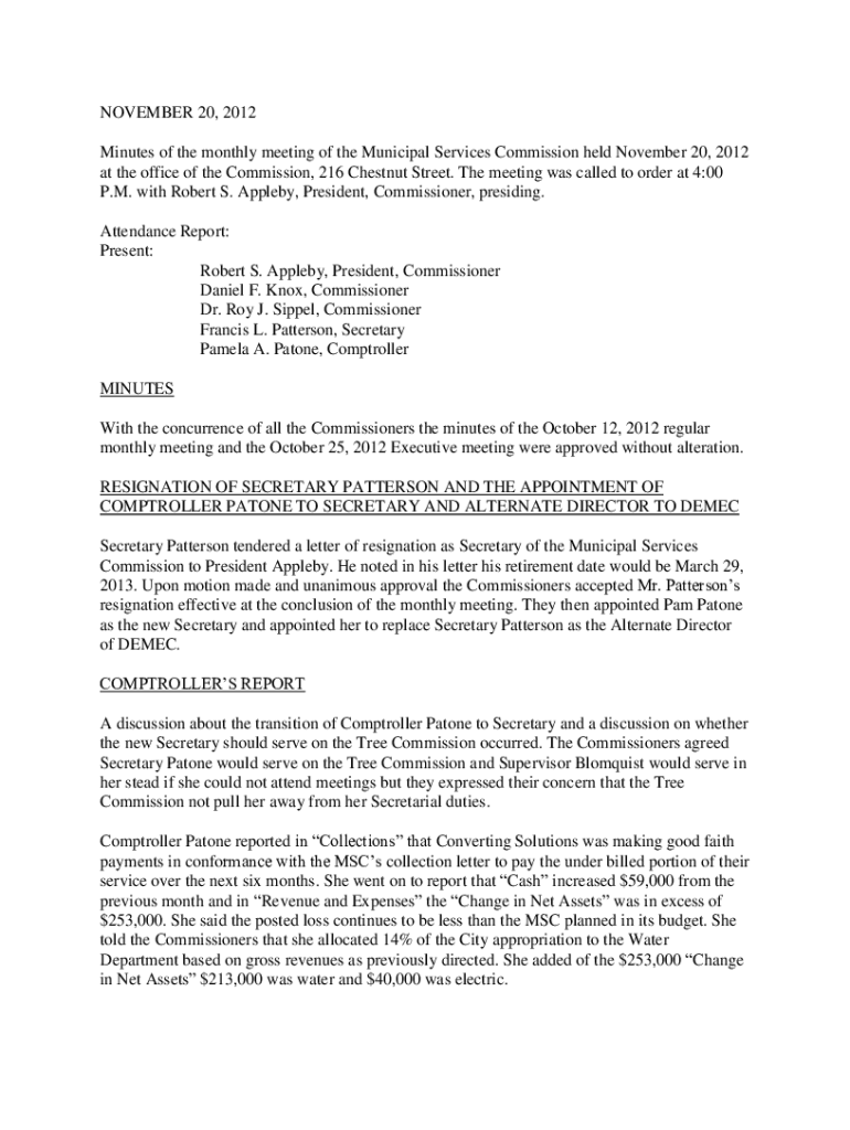NOVEMBER 20, 2012, Minutes of the monthly meeting of the Municipal Services Commission held November 20, 2012, at the office of the Commission, 216 Chestnut Street. The meeting was called to order
