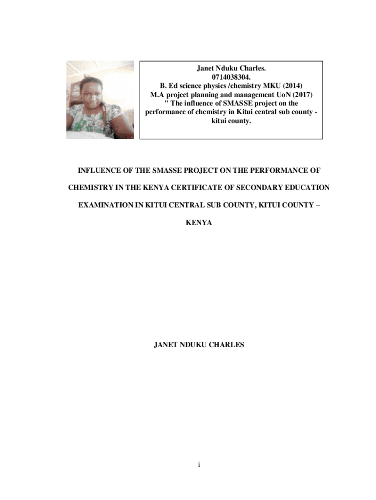 Janet Duke Charles. 0714038304. B. Ed's science physics /chemistry MK (2014) M. A project planning and management On (2017) \” The influence of SMASS project on the performance of chemistry in Kit