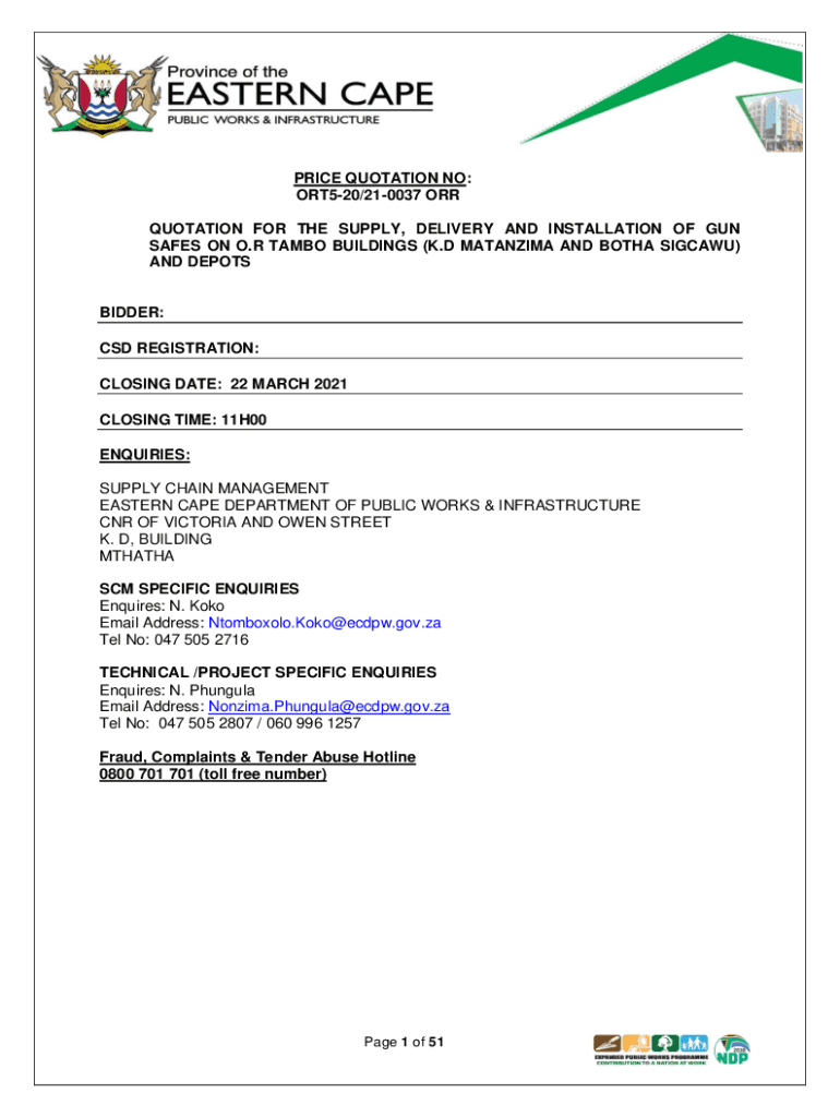 PRICE QUOTATION NO: ORT520/210037 ORR QUOTATION FOR THE SUPPLY, DELIVERY AND INSTALLATION OF GUN SAFES ON O. R RAMBO BUILDINGS (K. D CATANIA AND BOTHA SIGNAL) AND DEPOTSBIDDER: CSD REGISTRATION: CLOSING