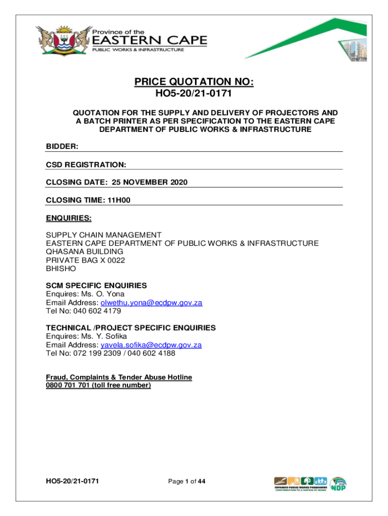 PRICE QUOTATION NO: HO520/210171 QUOTATION FOR THE SUPPLY AND DELIVERY OF PROJECTORS AND A BATCH PRINTER AS PER SPECIFICATION TO THE EASTERN CAPE DEPARTMENT OF PUBLIC WORKS & INFRASTRUCTURE BIDDER: