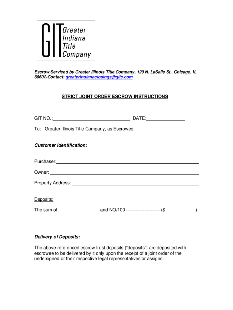 Escrow Serviced by Greater Illinois Title Company, 120 N. Basally St., Chicago, IL 60602Contact: greaterindianaclosings@gitc.comSTRICT JOINT ORDER ESCROW INSTRUCTIONS NO.:DATE:To: Greater Illinois