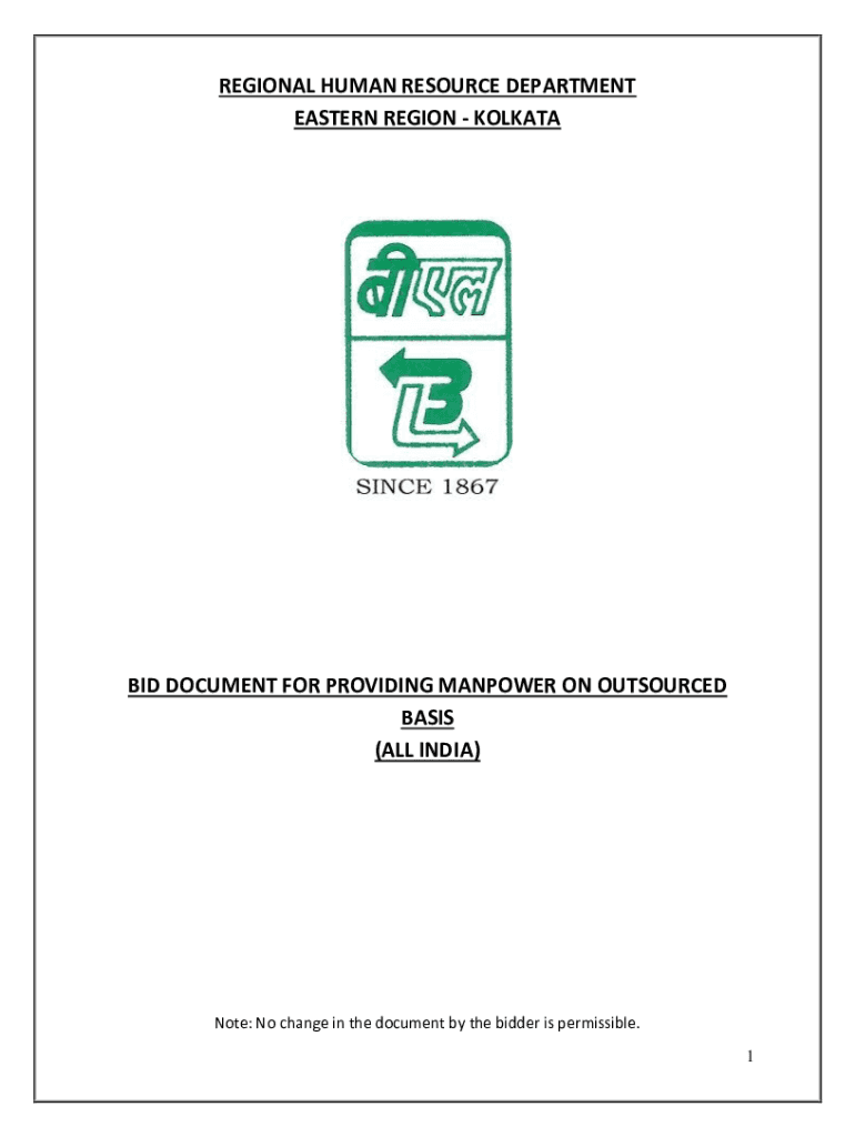 REGIONAL HUMAN RESOURCE DEPARTMENT EASTERN REGION KOLKATA DOCUMENT FOR PROVIDING MANPOWER ON OUTSOURCED BASIS (ALL INDIA)Note: No change in the document by the bidder is permissible. 1TABLE OF CONTENTSectionParticularsPage1INVITATION