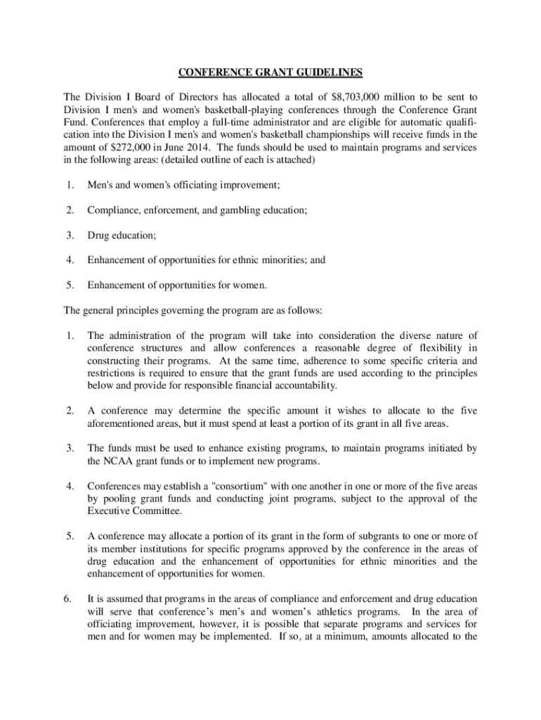 CONFERENCE GRANT GUIDELINES The Division I Board of Directors has allocated a total of $8,703,000 million to be sent to Division I men\'s and women\'s basketball playing conferences through the Conference