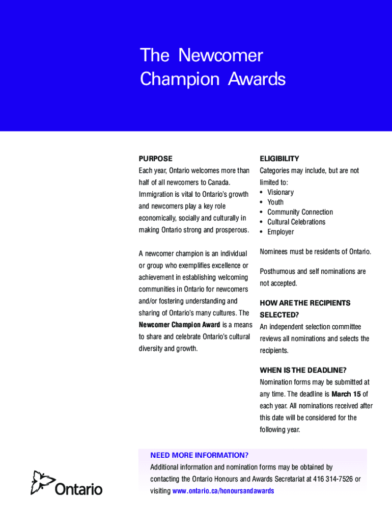 Champion AwardsPURPOSEELIGIBILITYEach year, Ontario welcomes more thanCategories may include, but are not half of all newcomers to Canada. Making Ontario strong and prosperous. Limited