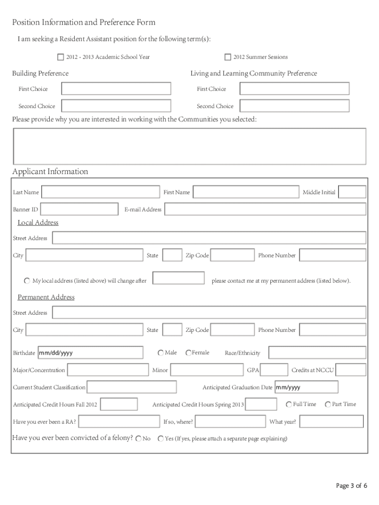Resident Assistant Application North Carolina Central University1801 Fayetteville St., Box 19382, Durham, NC 27707The Department of Residential Life is excited about your interest in becoming a part
