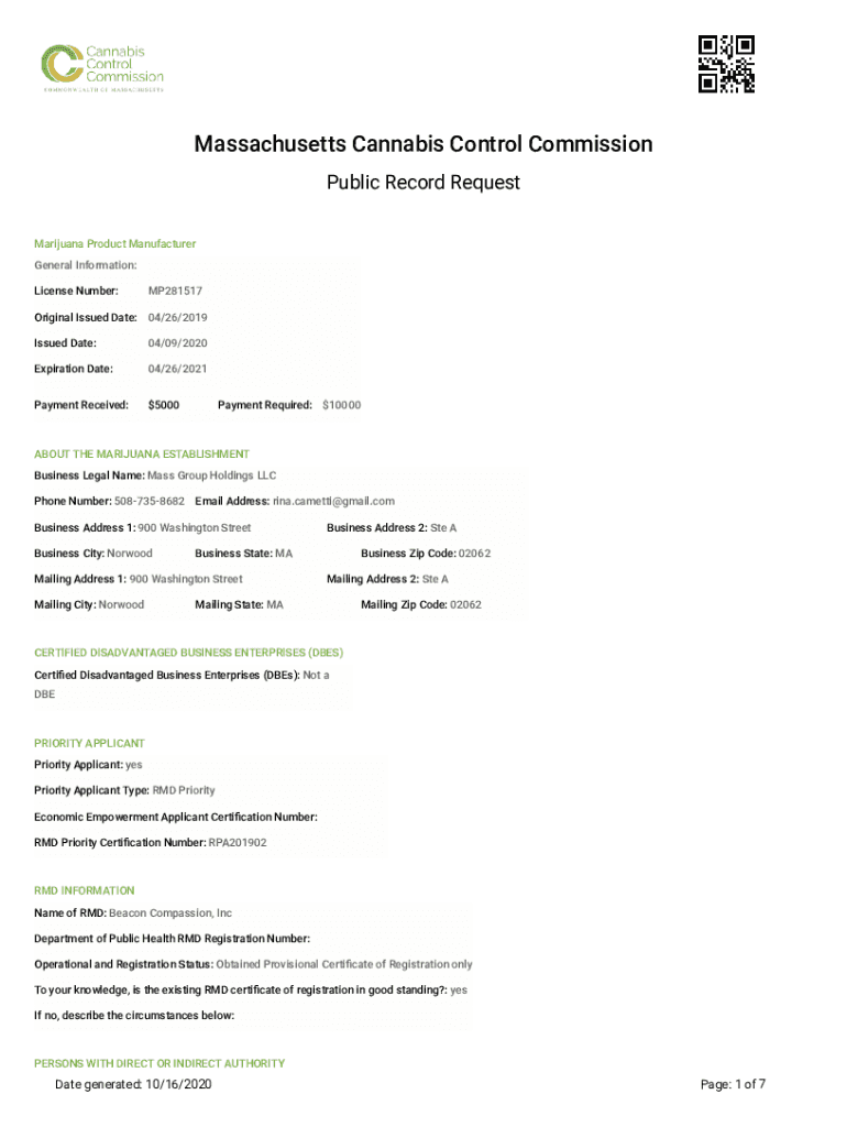 Massachusetts Cannabis Control Commission Public Record Request Marijuana Product Manufacturer General Information: License Number:MP281517Original Issued Date: 04/26/2019 Issued Date:04/09/2020Expiration