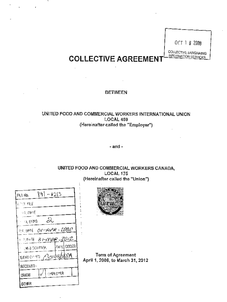 On COLLECTIVE AGREEMENT16 2ooaCOLLECTIVE BARGAINING INFORM!TON SERVICESBETWEENUNITED FOOD AND COMMERCIAL WORKERS INTERNATIONAL UNION LOCAL459 (Hereinafter called the \” Employer\”)inducted FOOD