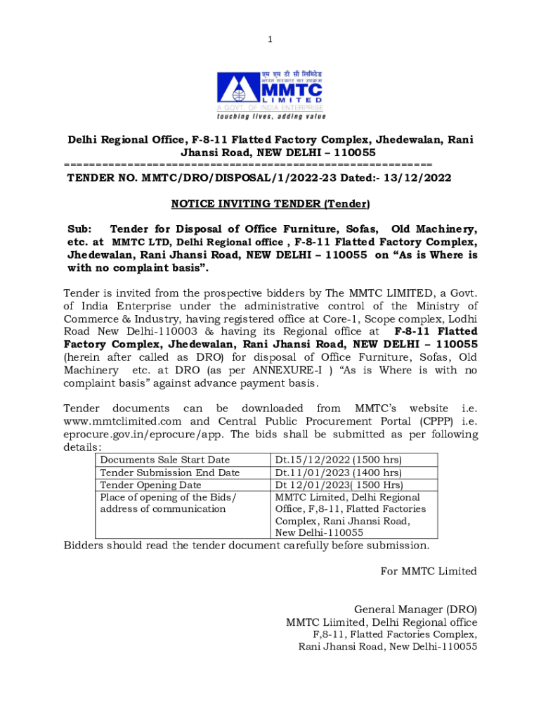 1Delhi Regional Office, F811 Flatted Factory Complex, Jhedewalan, Ran Jhansi Road, NEW DELHI 110055 TENDER NO. MTC/DO/DISPOSAL/1/202223 Dated: 13/12/2022 NOTICE INVITING TENDER (Tender) Sub: Tender