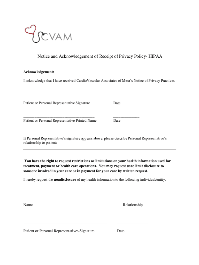 Notice and Acknowledgement of Receipt of Privacy Policy HIPAAAcknowledgement: I acknowledge that I have received Cardiovascular Associates of Mesas Notice of Privacy Practices.___ Patient or Personal