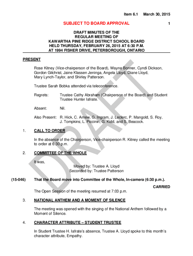 Item 6.1March 30, 2015SUBJECT TO BOARD APPROVAL1DRAFT MINUTES OF THE REGULAR MEETING OF MARTHA PINE RIDGE DISTRICT SCHOOL BOARD HELD THURSDAY, FEBRUARY 26, 2015, AT 6:30 P.M. AT 1994 FISHER DRIVE,