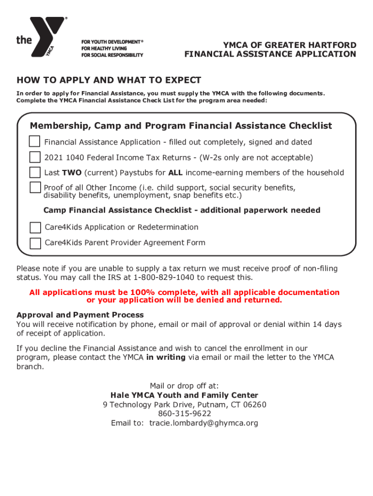 YMCA OF GREATER HARTFORD FINANCIAL ASSISTANCE APPLICATION TO APPLY AND WHAT TO EXPECT In order to apply for Financial Assistance, you must supply the YMCA with the following documents. Complete the