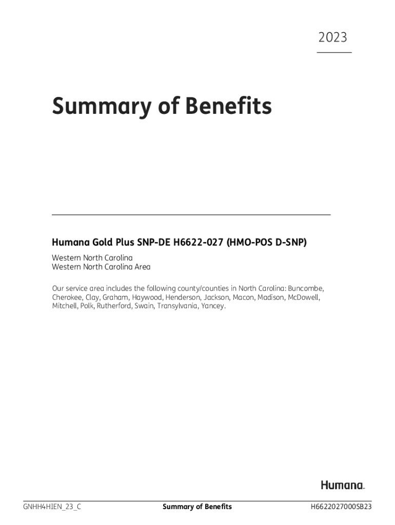 SBOSB0332023Summary of BenefitsHumana Gold Plus SNIDE H6622027 (HMO POS DSP) Western North Carolina Western North Carolina Area Our service area includes the following county/counties in North Carolina: