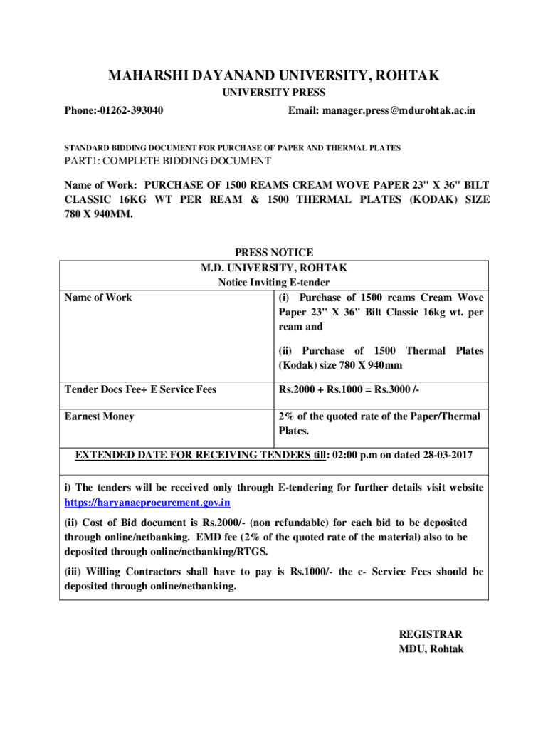 MAHARISHI DAYANA UNIVERSITY, ROTA UNIVERSITY PRESS Phone:01262393040Email: manager.press@mdurohtak.ac.inSTANDARD BIDDING DOCUMENT FOR PURCHASE OF PAPER AND THERMAL PLATESPART1: COMPLETE BIDDING DOCUMENT
