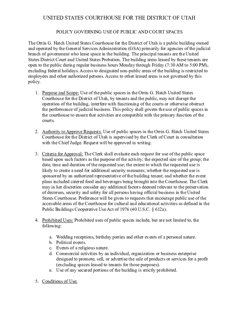 UNITED STATES COURTHOUSE FOR THE DISTRICT OF UTAH POLICY GOVERNING USE OF PUBLIC AND COURT SPACES The Orin G. Hatch United States Courthouse for the District of Utah is a public building owned and