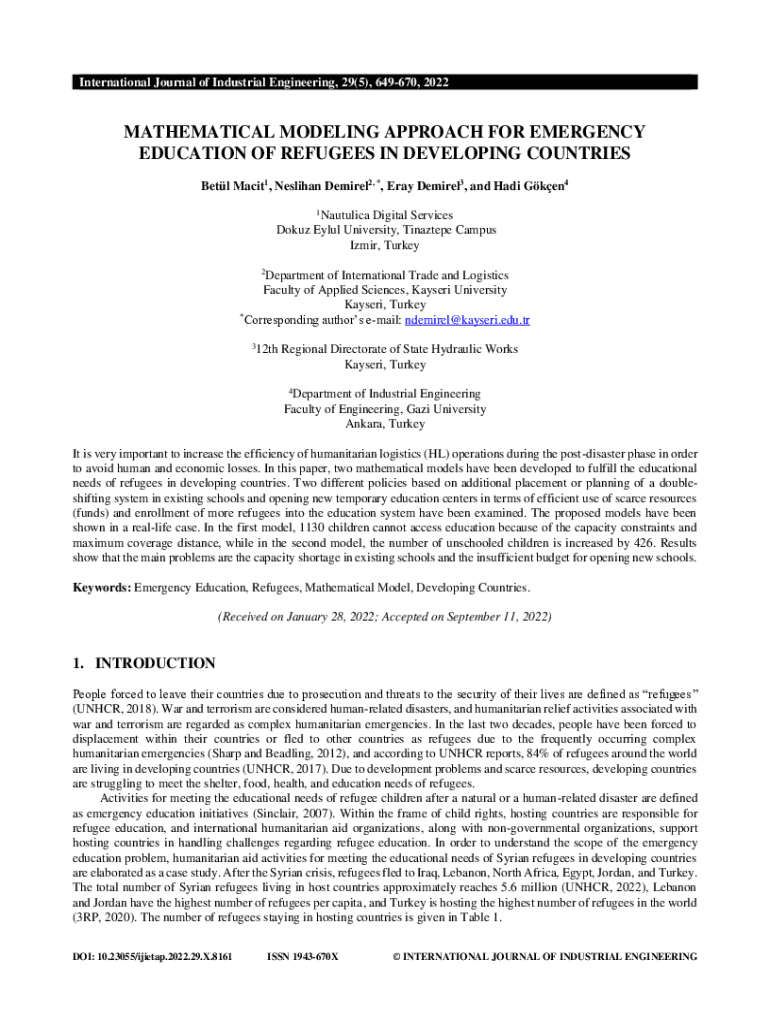 International Journal of Industrial Engineering, 29(5), 649670, 2022MATHEMATICAL MODELING APPROACH FOR EMERGENCY EDUCATION OF REFUGEES IN DEVELOPING COUNTRIES Belt Macit1, Lesbian Demirel2, *, Era