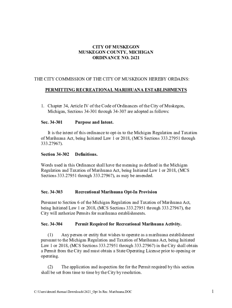 CITY OF MUSKEGON COUNTY, MICHIGAN ORDINANCE NO. 2421THE CITY COMMISSION OF THE CITY OF MUSKEGON HEREBY ORDAINS: PERMITTING RECREATIONAL MARIJUANA ESTABLISHMENTS 1. Chapter 34, Article IV of the Code
