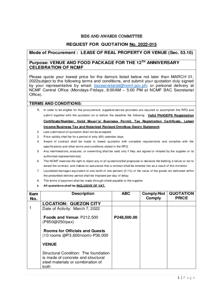 BIDS AND AWARDS COMMITTEEREQUEST FOR QUOTATION No. 2022015 Mode of Procurement : LEASE OF REAL PROPERTY OR VENUE (Sec. 53.10) Purpose: VENUE AND FOOD PACKAGE FOR THE 12TH ANNIVERSARY CELEBRATION OF