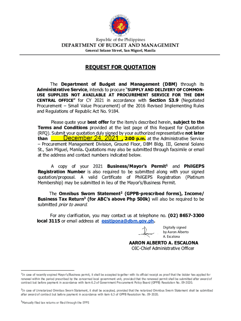 Republic of the PhilippinesDEPARTMENT OF BUDGET AND MANAGEMENT General Solano Street, San Miguel, ManilaREQUEST FOR QUOTATION The Department of Budget and Management (dBm) through its Administrative