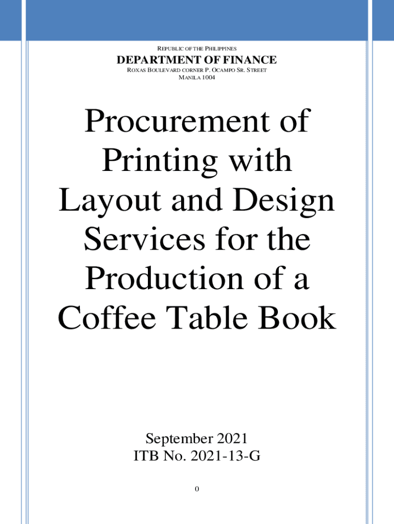 REPUBLIC OF THE PHILIPPINESDEPARTMENT OF FINANCE ROJAS BOULEVARD CORNER P. OCAMPO SR. STREET MANILA 1004Procurement of Printing with Layout and Design Services for the Production of a Coffee Table